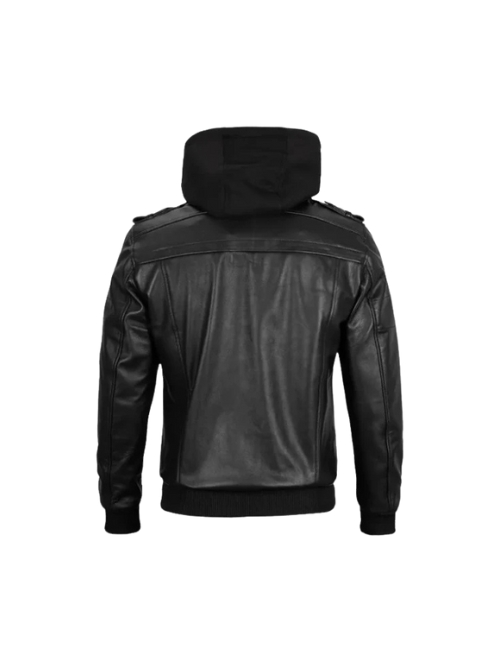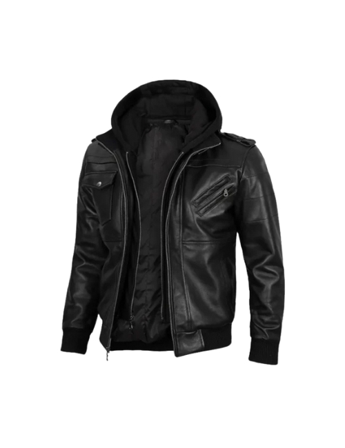 Men’s Black Leather Hooded Bomber Jacket