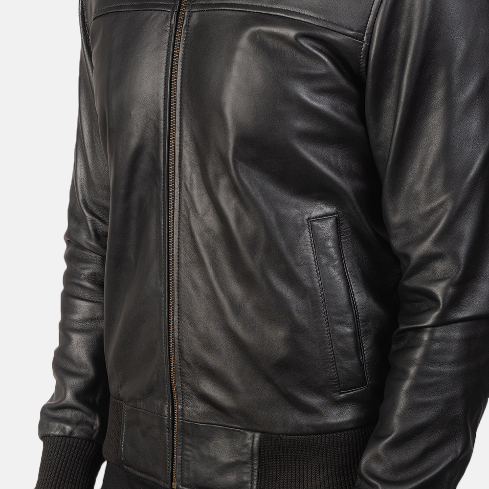Thane Dark Black Leather Bomber Jacket