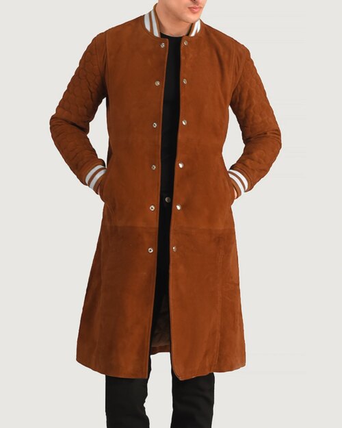 Step into a new era of menswear with our Wilde Varsity Coat—a bold reimagination of the revered varsity jacket. This unique creation merges the dramatic charisma of a knee-length leather coat with full varsity-style cuffs, collar, and front closure, setting a fresh tone for athleisure style. The honeycomb quilted sleeves are noteworthy, adding a captivating visual dimension to this avant-garde piece made from premium quality suede.